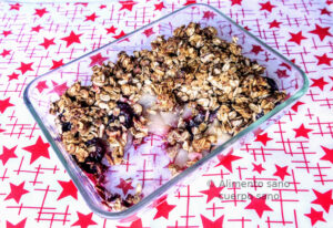 Receta de un postre saludable, se trata de un crumble de pera y cerezas, con alto contenido de fibra y bajo en azúcar refinado.